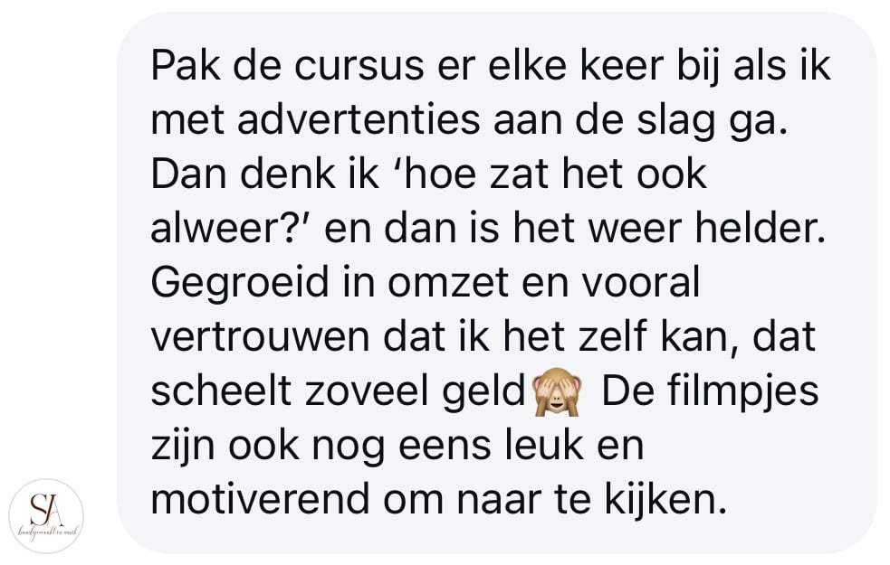 Zeker! Je leert stap voor stap hoe Meta advertenties werken en ziet precies hoe je ze volgens mijn bewezen strategie opzet, bijstuurt en opschaalt. Je hoeft niet veel technische kennis te hebben, als je maar bereid bent om te leren. Alles wordt praktisch uitgelegd, zodat je precies weet: wat je doet, waarom je het doet en wat je kunt verwachten. Je start klein en overzichtelijk, om de risico’s laag te houden.